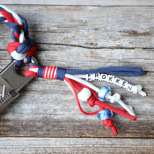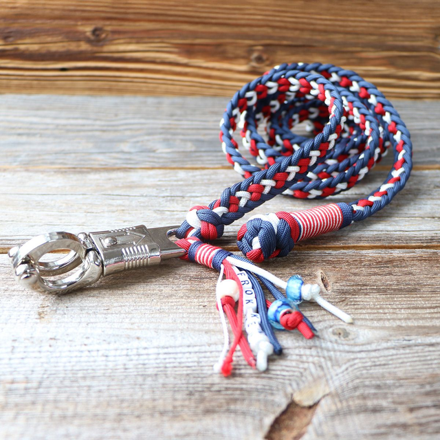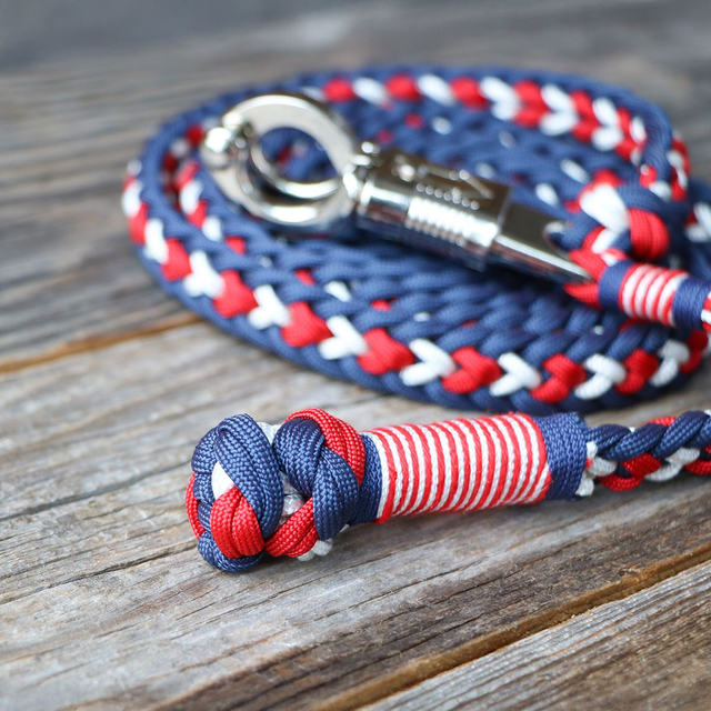 Unser personalisierter Pferdeführstrick wird aus hochwertigem original Paracord® in navy blau-weiß-rot auf Bestellung individuell handgefertigt. Den Abschluss des F+hrstricks bildet ein aufwändiger Diamantknoten. Ein Namensanhänger mit farblich passenden Perlen vervollständigt den Führstrick.
