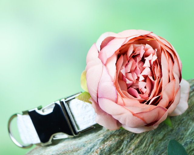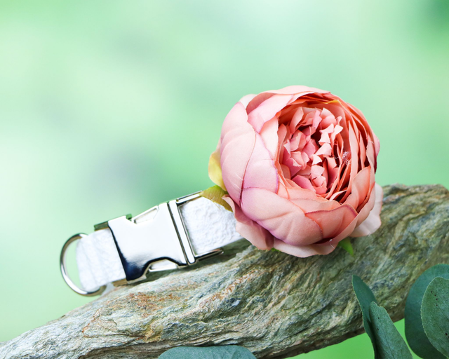 Unser Hochzeits-Hundehalsband besteht aus einem weißen Hundehalsband aus Baumwollstoff mit weißer Spitze und einer abnehmbaren Blütenapplikation mit altrosa Pfingstrose