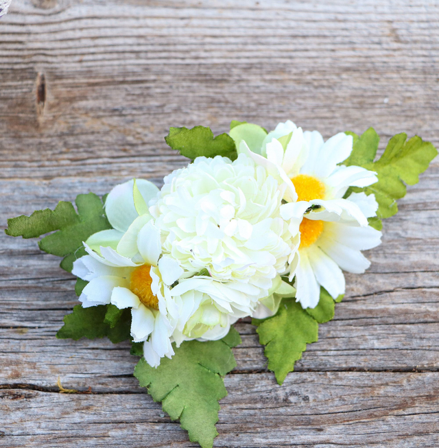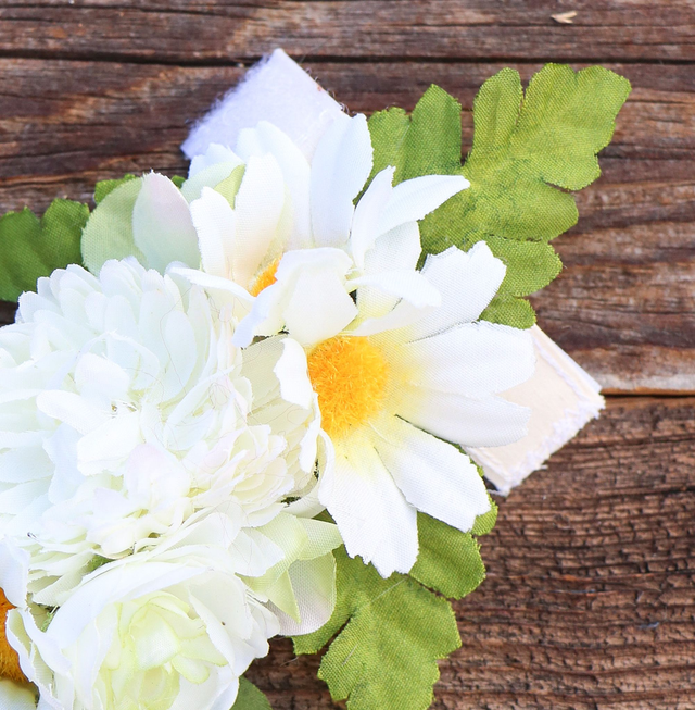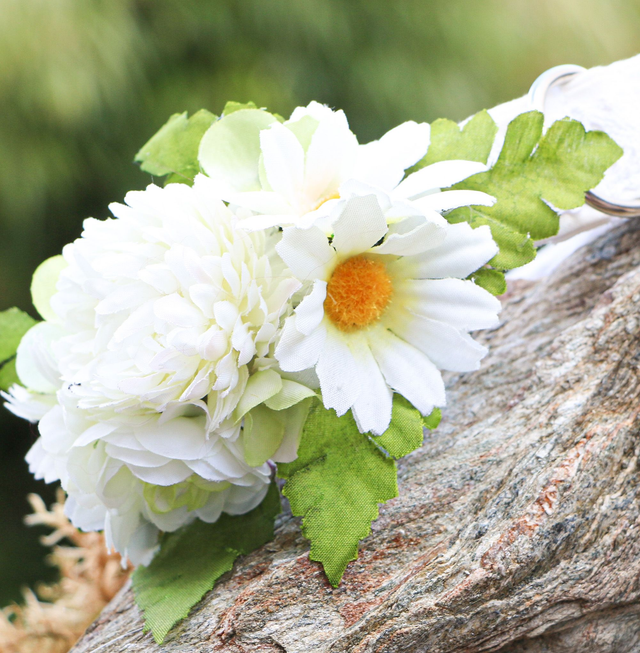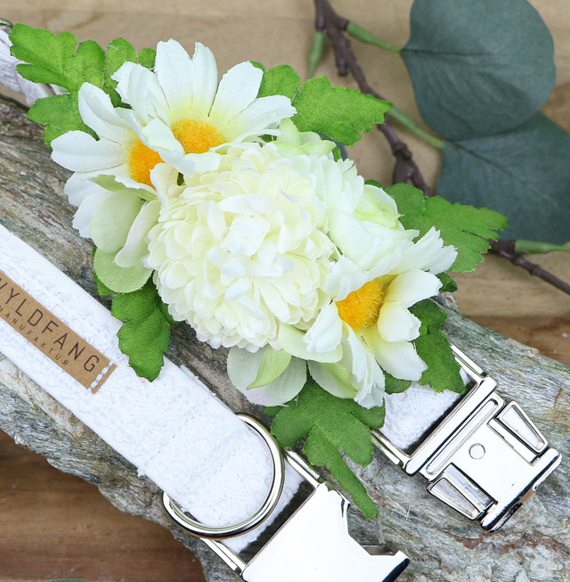 Unser Hochzeits-Hundehalsband besteht aus einem weißen Hundehalsband aus Baumwollstoff mit weißer Spitze und einer abnehmbaren Blütenapplikation mit Margariten.
